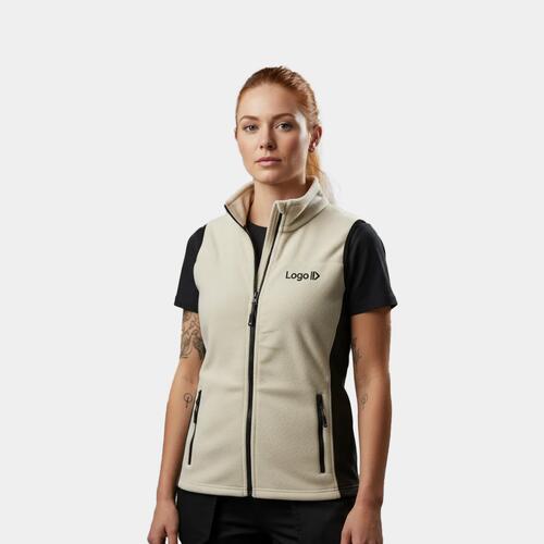Beżowa damska kamizelka polarowa z pełnym zamkiem błyskawicznym i kieszeniami bocznymi.