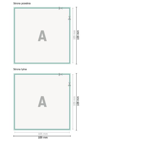 - Format danych (wraz z 2 mm spadem): 10,9 x 10,9 cm
