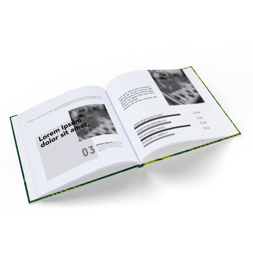 - Książka w twardej oprawie w orientacji pionowej z prostym grzbietem i rogami zakończonymi na ostro oraz białą kapitałką